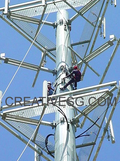 Self Supporting Steel Monopole Structure DesignsThe rapidly growing and increasingly competitive Telecommunications, and wireless Communication Industries requite fast, flexible and cost efficient infrastructure project implementations. Contractors and suppliers who can meet those demands allow Operators to gain revenues early on and reduced internal cost overheads. CREATIVE ENGINEERING & COMMUNICATIONS PTE LTD addresses these market demands by Introducing standardized antenna supporting structures using Monopoles , thereby guaranteeing short design phases. This approach consequently ensures minimum lead times from the initial order to the actual of project implementations Type of Standard Antenna Supporting Self Supporting Monopole constructed from High Tensile steel materials and connection using slip joints or Flange joint Design Wind Speed: 120- 250km/hr Custom design to Client requirement Design Criteria Standard The design criteria are based on an extensive research on antenna supporting structures fulfilling the majority of technical specifications and requirements of Mobile infrastructure applications International Design Standards and Codes such as (BS 8100,EIA/TIA -222G) are used. Antenna Design Loading: Custom design to Client requirement Final Materials Finishes Hot dipped Galvanised to BS729 or ASTM 123 standards Bolts and Nuts. All the connections in the field shall be made with galvanized Grade 8.8 steel bolts, each fitted with one spring washer. ACCESSORIES Ladder Generally the ladders are built on the outside of the pole or inside the pole which depend on client requirements. tower. Safety Climb With new OH&S standards, where practical, riggers now have to be attached at all times. Creative stock a full range of fall arrest systems. The safety device incorporates a steel cable, which is installed on the climbing structure. Riggers equipped with a harness and with sliding sleeve ascend the structure while constantly attached to the cable. Feeder Brackets Monopole generally have feeder brackets which secure the cables running up to the equipment on the structure. The feeder Brackets can be installed outside or inside the pole. Cable Tray Cable trays have a similar purpose to feeder brackets. A cable tray can be run vertically the whole way up the structure; however it is more commonly used to support and secure cables from the lower part of the structure horizontally to the equipment shelter. Lightning Protection A lightning finial is used at the top of the structure which under normally conditions would be struck by a lightning hit instead of equipment fitted to structure. Earthing Our standard earthing kit comprises of a galvanised steel 3m strap attached to the structure which is connected to a 1m stake in the ground. Platforms Platforms can be supplied are: